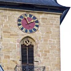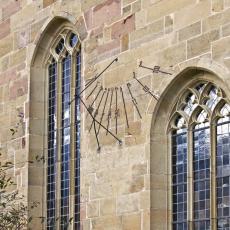 Nicht weniger als sechs Sonnenuhren befinden sich an den Außenwänden der Regiswindiskirche. Die Westwand-Sonnenuhr von 1506 ist eine der prächtigsten.
