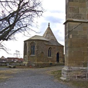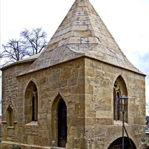 Über dem ursprünglichen älteren Bau mit vier gleich breiten Wandflächen gipfelt sich das Dach mit einer achtseitigen durchbrochenen Pyramide und einem steinernen Kreuz, östlich schließt sich ein kleiner Chor mit eigentümlicher Gewölbekonstruktion an, ein Werk aus späterer Zeit, wie man leicht an den verschieden gebauten Fenstern erkennen kann. In den vier Tragsteinen dieses Gewölbes, charaktervollen Köpfen, wollte Stadtpfarrer Krauß 1851 "unverkennbar die tragische Geschichte der Heiligen dargestellt" sehen. An der Nordseite des Chörleins befindet sich eine feingestaltete Nische für ein Heiligenbild, das aber längst verschwunden ist.
