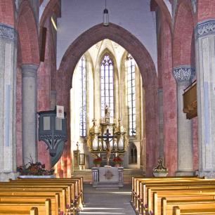 Der Bau der ehemaligen Wallfahrtskirche zu Ehren der Ortsheiligen Regiswindis wurde 1227 als dreischiffige Basilika begonnen.