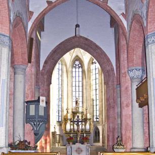 Die Regiswindiskirche wurde ab 1227 im basilikalen Schema errichtet, d.h. die beiden Seitenschiffe waren niedriger als das Mittelschiff. Aus dieser Zeit stammen noch die niedrigeren Spitzbogenfenster an der Südfassade. Nach der Zerstörung durch Blitzeinschlag 1564 wurde die Kirche als Hallenkirche mit 3 gleich hohen Schiffen wiedererrichtet. Aus dieser Zeit stammt auch die manieristische Ausmalung mit Rollwerk und Fabelwesen.