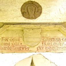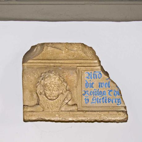 Neben dem vermauerten Schluss-Stein mit einem Christuskopf befindet sich ein Stein mit dem Wappen der Thumb, der Ortsherrschaft im 16. Jahrhundert, mit der Inschrift:
