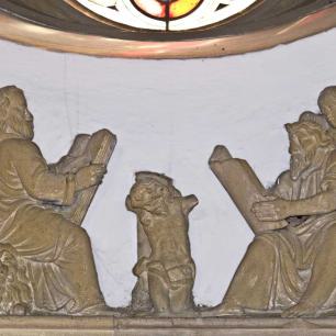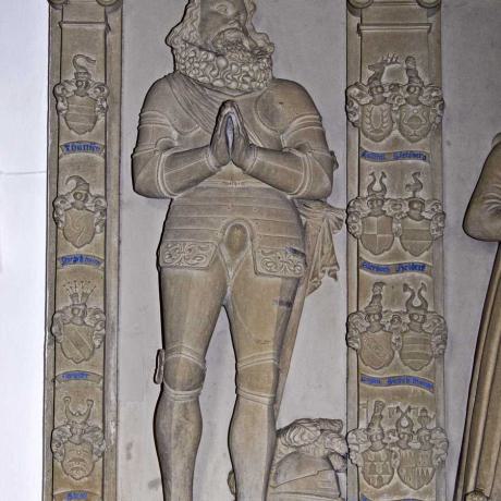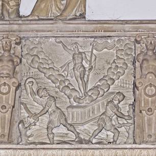 Um die großen Grabmale finden sich verschiedene Ahnenwappen eingehauen. Über den beiden Figuren ist die Darstellung von der Auferstehung Christi, der Himmelfahrt und Pfingsten.