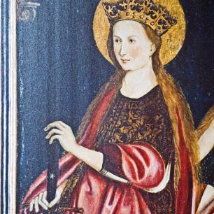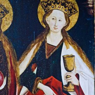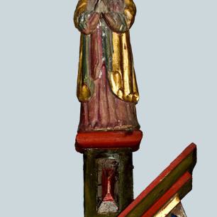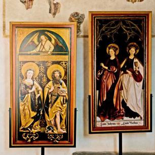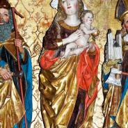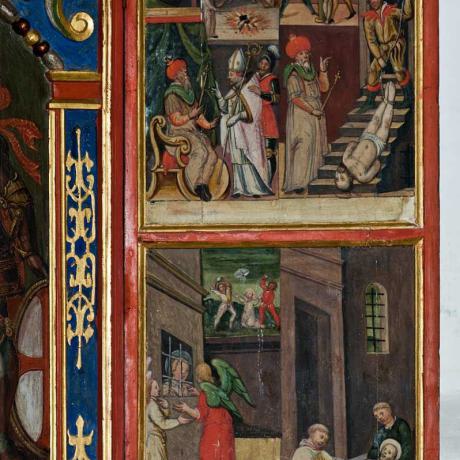 Bemalter Flügelaltar von 1633. Er wurde bei der Renovierung des Hochaltars wieder zusammengesetzt und an der Südwand (*) aufgehängt. Das Mittelstück zeigt die Muttergottes zwischen St. Eusebius und Georg, auf den Innenseiten der Flügel ist die Legende des Titelheiligen dargestellt. (siehe Diashow mit Einzelerläuterungen darunter)