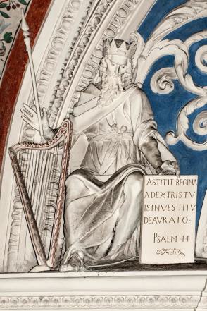 Der Fries des Gebälkes und die Archivolte des Chorbogens ist belegt mit spiralförmig gewundenem Akanthus, auf dem Gesims zu Seiten des Chorbogens sitzen zwei vollplastische Figuren des Königs David, die ihn thronend und auf der Harfe spielend zeigen. Im Scheitel das Kapuzinerwappen", auf den Archivolten der Seitenkapellen Engelchen. Die Deckengemälde sind in Stuckrahmen eingeordnet, die, gekröpft oder medaillonartig, mit Eierstab und Blattmuster geziert sind; andere auch kartuschenförmig mit eingerollten Bändern. Dazwischen Akanthus, Girlanden und Engelsköpfe.