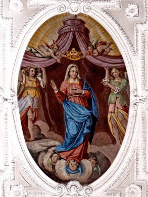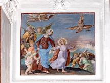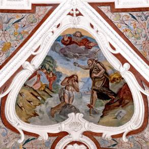 E) Am Gewölbe der Vierung: Immakulata, Taufe im Jordan, Versuchung. Diese gesamte Dekoration stammt offenbar von gleicher Hand, von dem oben genannten JOH. BAPT. MACHOLINO aus dem Val S. Giacomo. Die Bilder sind durch Übermalung entstellt; in der Komposition versucht der Maler bisweilen kühne Verkürzungen, die sein Können nicht zu bewältigen vermag. (Poeschel)