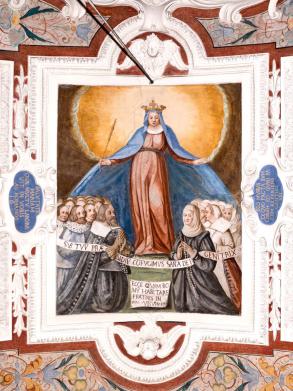 C) Am Gewölbe des südlichen Querschiffes: Bild des göttlichen Zornes, Schutzmantelmaria und Rosenkranzmadonna. Dazu gehören ikonographisch die Darstellungen der Rosenkranzgeheimnisse in der südlichen Seitenkapelle.