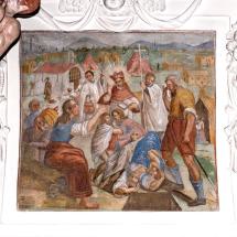 B) Am Gewölbe des Hauptschiffes: Passion und Himmelfahrt Christi in neun Szenen. Auf der Darstellung des Abendmahles die Meistersignatur: GO BAPTA MACOLINUS VALLIS SI JACOBI PINXI ANNO DOMINI 1639. Zu diesem Zyklus gehören auch noch zwei Bilder an den Wänden des Hauptschiffes: Beweinung, mit Stifterwappen Montalta, und Christus in der Vorhölle, mit Inschrift und Wappen des Canonicus Scholasticus Christian Cabalzar. An den Langhauswänden ferner die Hl. Familie und St. Martin.