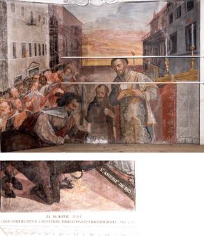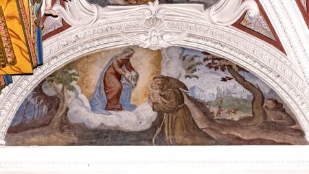 A) im Chor: am Gewölbe die Evangelisten, in den Schilden St. Franziskus und Felix von Cantalice, an den Wänden Szenen aus der Kindheit Christi.