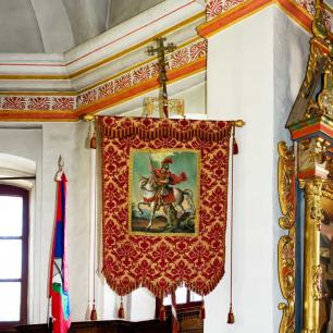 Blasonierung: In Rot auf silbernem Pferd der heilige Georg mit silbernem Nimbus und grünem Mantel einen grünen Drachen tötend. Im rechten Obereck ein silbernes Andreaskreuz.