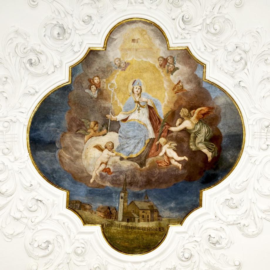 Die Pfarrkirche ist dem Hl. Vigilius von Trient geweiht. Patrozinium am 26. Juni, zufällig (Fügung ?) an dem Tag, an dem ich die Kirche fotografierte. Aus Anlaß des Patroziniums war seine Statue in der Kirche (neben dem linken Seitenaltar / vor dem Chor) aufgestellt.