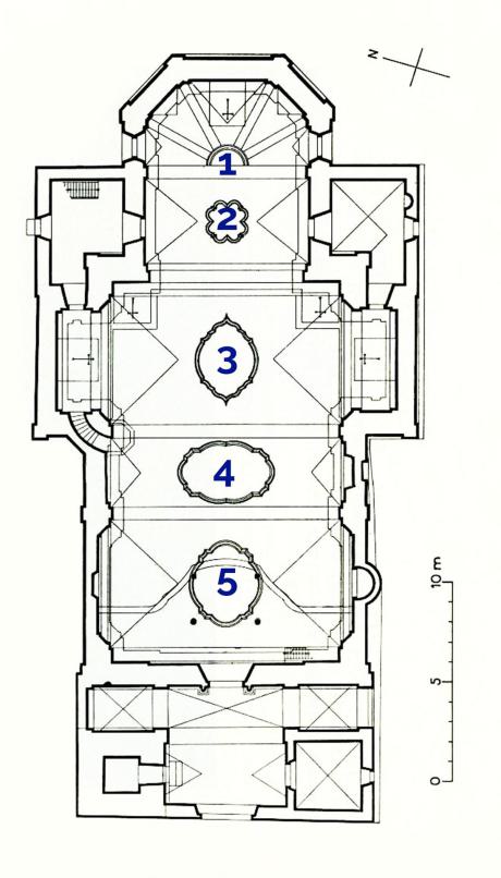 - 4 Chor mit Hochaltar, Stuckdecke, Chorgestühl, Reliquienschreine