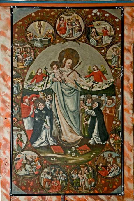 Das Bild stammt aus der Pfarrkirche, wo es nach dem Bericht von 1643 auf dem rechten Seitenaltar stand; zum Einbau musste es an den Seiten stark beschnitten werden. Die Komposition vereinigt das Bildschema der Rosenkranzkönigin mit der Mater misericordiae: unter dem ausgebreiteten Mantel der Maria Vertreter geistlicher und weltlicher Stände, vor ihr St. Dominikus und Katharina v. Siena, kniend den Rosenkranz empfangend. Das Ganze umrahmt von den 15 Medaillons der Marien-Mysterien. Datum 1627 und das Monogramm des Hans Jakob Greutter (Poeschel)