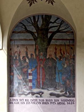 Die toskanische Vorhalle war ursprünglich wohl nicht geplant, da sie die Rundbogen überschneidet, die die Kapelle rundum gliedern. Die ersten Bemalungen der Vorhalle stammten aus dem 18. Jahrhundert. 1836 wurden sie durch Fresken von Ludwig Kühlental ersetzt, die bei der Renovation von 1924 durch Fresken von Otto Baumberger ersetzt wurden. Sie zeigen die Gründung des Grauen Bundes vom 16. März 1424 und dessen letzte Erneuerung von 1778.