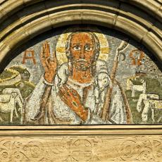 In der Rosette des rechten Querschiffes ist das Lamm Gottes zu erkennen, umgeben von der großen Schar der Erlösten in weißen Gewändern mit Palmzweigen in den Händen.