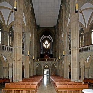 Der achteckige Raum an der Stelle, wo Längs- und Querschiff sich kreuzen: Durch die zurückgenommenen Emporen über den Seiteneingängen entsteht so ein Gottesdienstraum im Zentrum der Kirche.