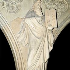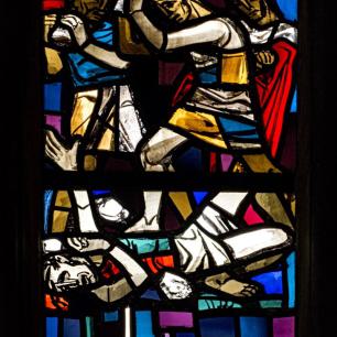 Das linke Fenster steht für die hebräische Bibel und zeigt die Geschichte von Kain und Abel. Darüber sieht man die Gesetzestafeln und den siebenarmigen Leuchter. Beide Symbole stehen für den Gottesdienst des Volkes Israels und den Bund, den Gott mit ihm geschlossen hat.