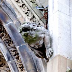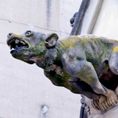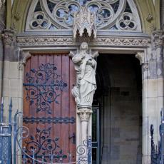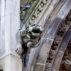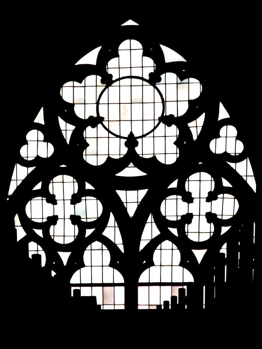 die hohen spitzbogig zulaufenden mit steinernem Maßwerk geschmückten Fenster und Portale,