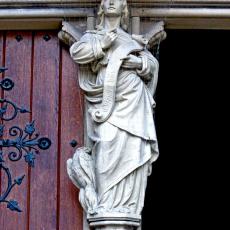 Rundgang um den Feuersee / die Kirche . Beginnend beim Hauptportal / Nordseite (Blick aus der Johannesstraße), dann entgegen des Uhrzeigersinns. Danach Details an Portal und Gemäuer.