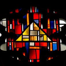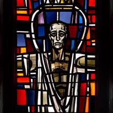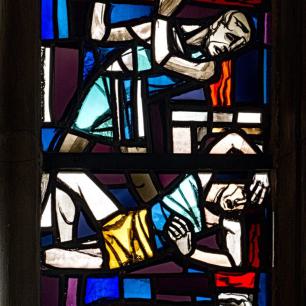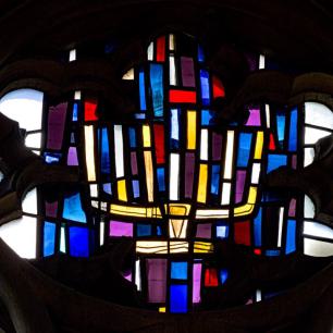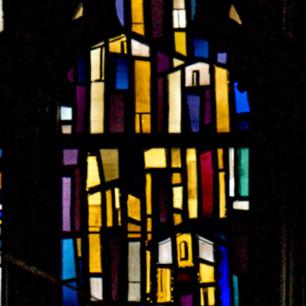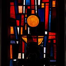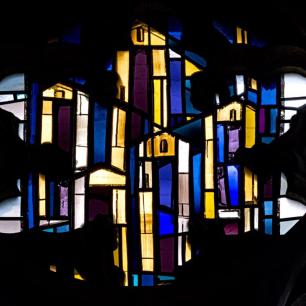 Die drei zusammenhängenden Fenster im Chorraum wurden 1969 von Professor Rudolf Yelin geschaffen.