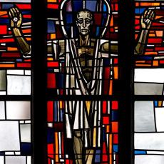 Im Mittelpunkt ist der gekreuzigte Jesus zu sehen, der gleichzeitig auch als der Erhöhte mit der Krone dargestellt ist. Die Hände, mit Nägeln ans Kreuz genagelt, sind gleichzeitig segnende. Der horizontale Kreuzbalken, der auch die beiden Fenster links und rechts mit einschließt, soll weitergedacht werden und wird gewissermaßen zu den offenen Armen Jesu Christ: Alle, die sich in der Kirche befinden, sollen sich von ihnen umfangen wissen.