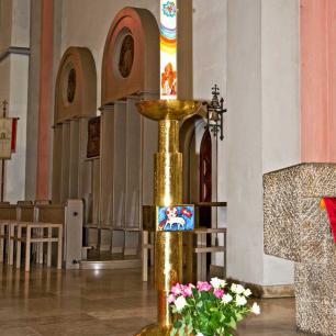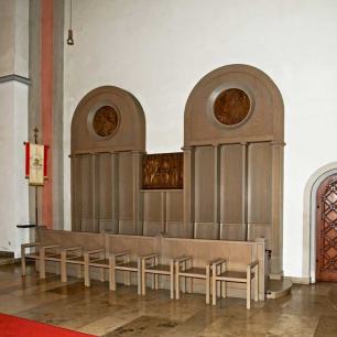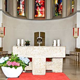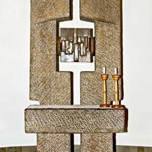 Altar, Ambo, Tabernakelstele, Priestersitz und Taufstein aus Muschelkalk wurden anläßlich der Renovation 1969 von Alfred Appenzeller geschaffen.