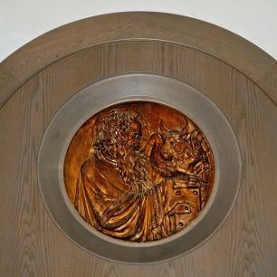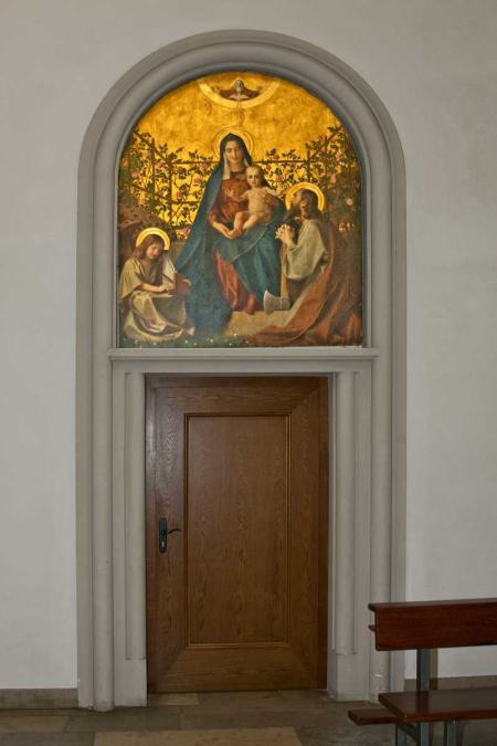 Das Tafelbild der Heiligen Familie, gemalt 1903 von Gebhard Fugel (vor 1969 im Seitenaltar der Heiligen Familie im rechten Querhaus, nach 1969 rahmenlos hinter dem Taufstein aufgehängt), hat im Tympanon des neugeschaffenen Türbogens seinen Platz gefunden. Es gibt der 1969 angelegten Sakristeitür im rechten Querhaus eine ihrer Bedeutung entsprechende Gestaltung (siehe auch die Tympanonreliefs über den Seitenportalen: links Christus am Ölberg, rechts Christus als Weltenrichter).