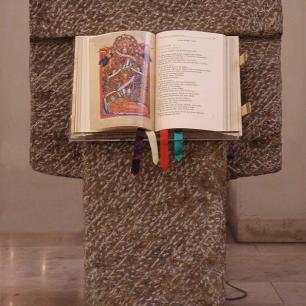 Für das kostbare Evangeliar wurde in St. Elisabeth ein Thronus geschaffen. Nach dem Evangelium wird das Evangeliar vom Priester, begleitet von den Akolythen, in feierlicher Prozession dort hin getragen und sichtbar für die Gemeinde abgelegt. Der Thronus ist aus Plexiglas und Stahl für den Ambo von Alfred Appenzeller gestaltet. Quelle: Website Kreuz + Kreuz Freie Architekten