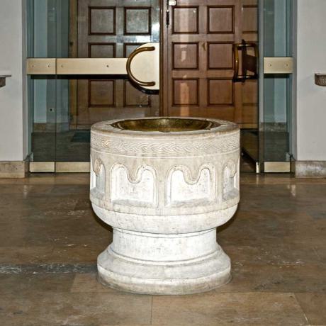 Der Taufstein von 1901 steht seit 1988 als zentrales Weihwasserbecken im Eingangsbereich der Kirche.