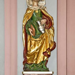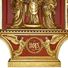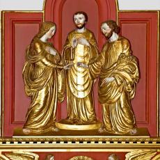 Die halbplastische Figurengruppe der Vermählung Mariens (vor 1969 Teil eines Flügelaltars unter der Empore im linken Querhaus, nach 1969 an der linken Querhausrückwand aufgehängt) wurde ergänzt mit einer neuen Rückwand und vervollständigt mit der alten Predella sowie den beiden vergoldeten Flügeln, die in schöner Reliefschnitzerei Bilder aus dem Leben Mariens zeigen. Die Gruppe hängt an der linken Querhausstirnwand, thematisch der beherrschenden Marienstatue im linken Querhaus zugeordnet, gestalterisch als Gegenstück zur Gruppe der sechzehn Heiligen im rechten Querhaus.
