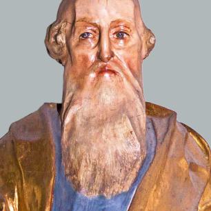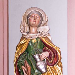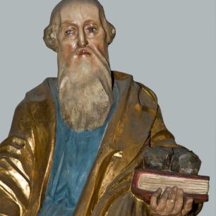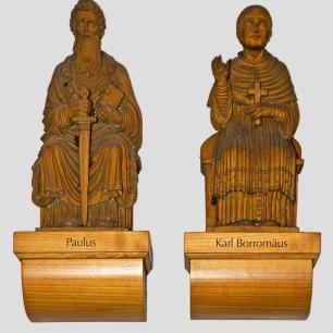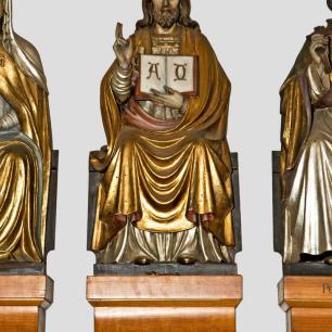Die Holzskulpturen von Christus und sechzehn Heiligen (vor 1969 Schmuck von Kanzel und Altären, nach 1969 rechts und links auf Konsolen an den Wänden des Chorraums aufgereiht) wurden zu einer Gruppe von Heiligen zusammengefaßt, die sich stehend und sitzend um Christus scharen. Die Figurengruppe ist an der rechten Querhausstirnwand hinter dem Taufstein angeordnet, also dort, wo die Kinder im Sakrament der Taufe den Namen eines Heiligen erhalten.