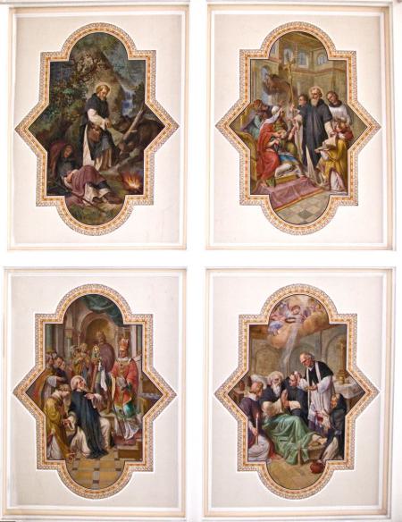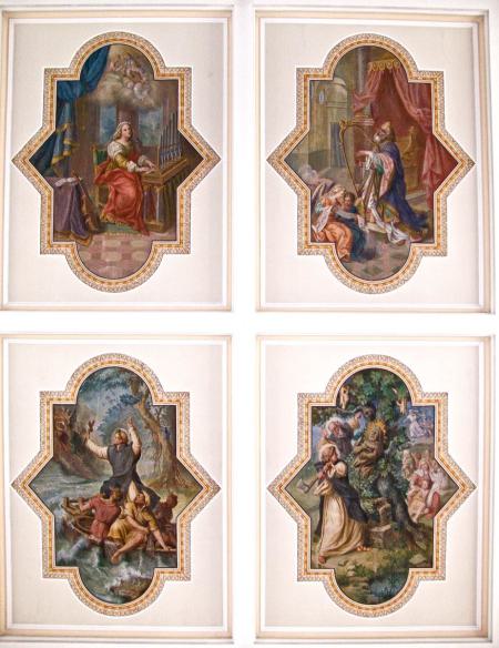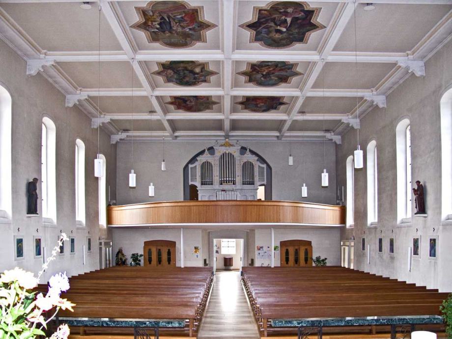 Die Deckengemälde im Chor und im Mittelschiff sind Werke des Kunstmalers Siebenrock aus Stuttgart. Sie wurden 1903 geschaffen, als man die Kirchenschiffmauern um 2 m erhöhte und die Kirche einen neuen Dachstuhl bekam. Auf dem großen Deckengemälde im Chor ist Jesus mit seinen Jüngern beim Letzten Abendmahl dargestellt. Das Mittelschiff ist in große Felder aufgeteilt. Der Zyklus beginnt über der Orgelempore und zeigt die Schutzpatrone der Kirchenmusik: König David mit Harfe und die hl. Cäcilia an der Orgel. Die weiteren sechs Bilder sind dem Andenken des Kirchenpatrons St. Gallus gewidmet. Sie zeigen Szenen aus der Lebensgeschichte des Heiligen.