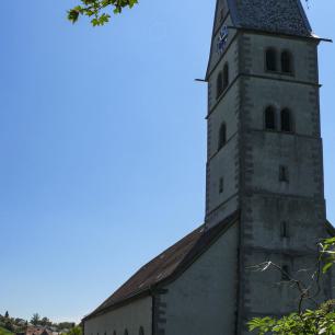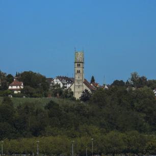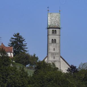 Auffällig, vor allem, wenn man sich Meersburg mit der Fähre aus Staad nähert, ist der um 90° gedrehte Kirchturm, der Baugeschichte (s.o.) geschuldet.
