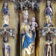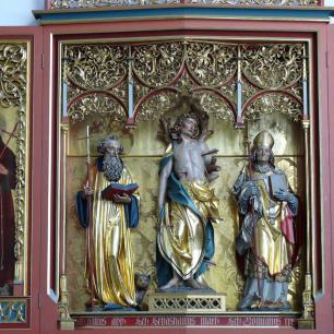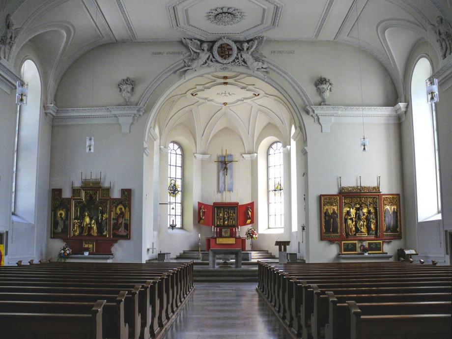 Der Hochaltar ist im Mittelteil ein spätgotischer Schrein aus dem 15. Jahr-hundert aus der Nähe von Weimar. Über Umwege kam er bei der Innenrenovation 2002 an diese Stelle. Es stellt in der Mitte die Gottes-mutter Maria mit dem Jesuskind dar. Umgeben von verschiedenen Heiligen. Das Kreuz darüber mit seinem barocken Korpus lässt durch den blauen Grund österliche Hoffnung anklingen. Über dem Schrein moderne Andeutungen von Sprengwerken. Auf den angedeuteten Außenflügeln sind der Heilige Bischof Konrad, und der heilige Pelagius dargestellt. Beides Patrone des früheren Bistums Konstanz. Meersburg war ja bis zur Säkularisation Residenz der Konstanzer Bischöfe. Reliquiare beider Heiligen hängen in barocker Fassung über den beiden seitlichen Türen des Chorraumes.