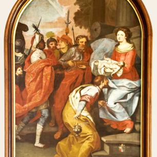 Das Altarbild zeigt die Vision des Karmeliten Simon Stock im Jahr 1251, wonach dieser von Maria das Skapulier überreicht bekommt, das seither nicht nur zum Habit der Karmeliten gehört, sondern auch zur Gründung der Skapulierbruderschaften führte, einer Laienvereinigung, die sich in besonderer Weise der Gottesmutter Maria verbunden fühlt. (Gerhard Wachter)