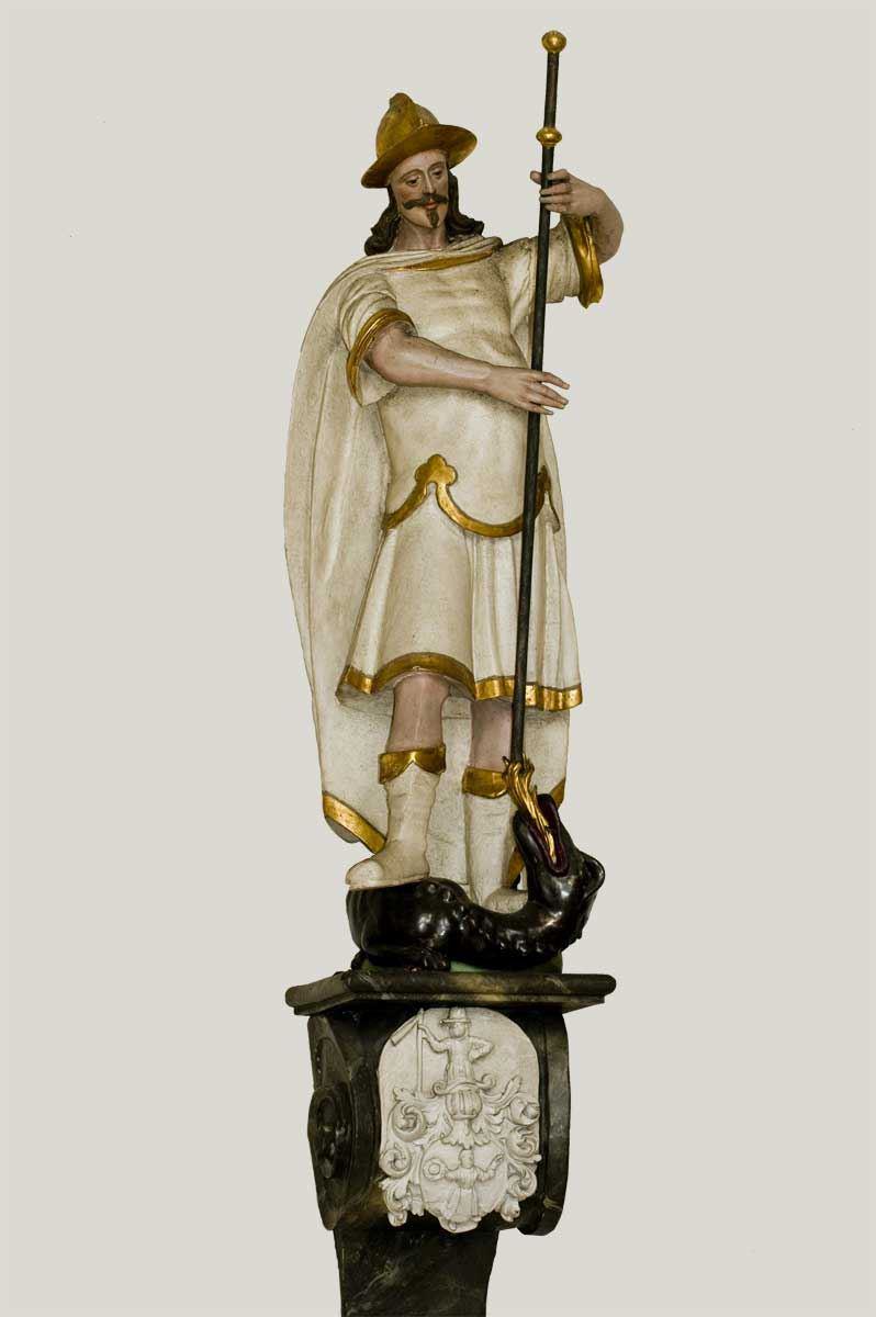 Sein Symbol ist das sogenannte Georgskreuz. Das rote Kreuz auf weißem Grund ist in vielen Wappen und Flaggen enthalten. Weitere Heiligenattribute sind der Drache, die Lanze sowie seine Darstellung als Ritter und Reiter. Der Märtyrer wird teilweise mit Palmwedel dargestellt. (Wikipedia)