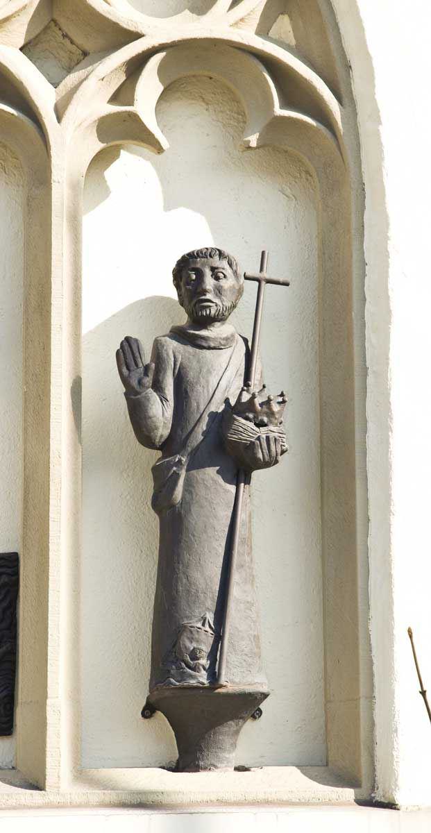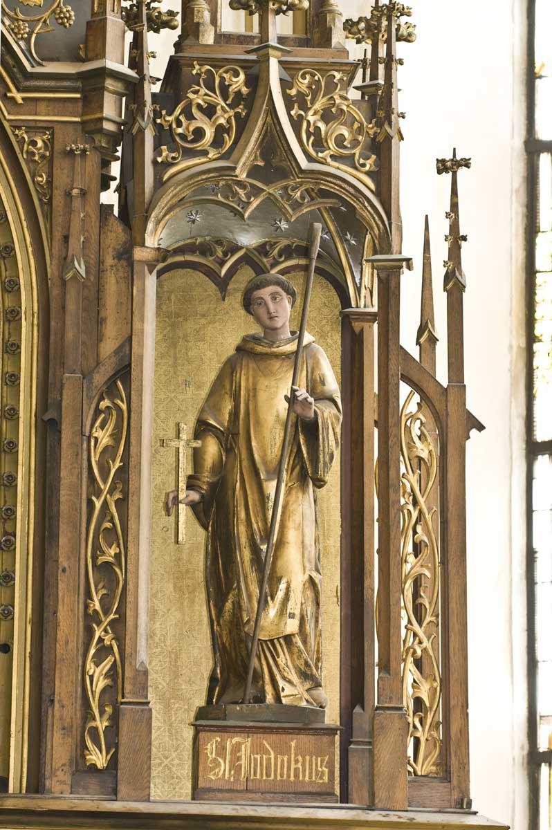 Jodok wird in der Kunst als Einsiedler, Priester oder Pilger dargestellt. Fast immer weist eine Krone zu seinen Füßen auf den Herrschaftsverzicht des Königssohns hin. In manchen Darstellungen stößt Jodok die Krone mit einem Stab in die Erde, aus der eine Quelle entspringt. (Wikipedia)