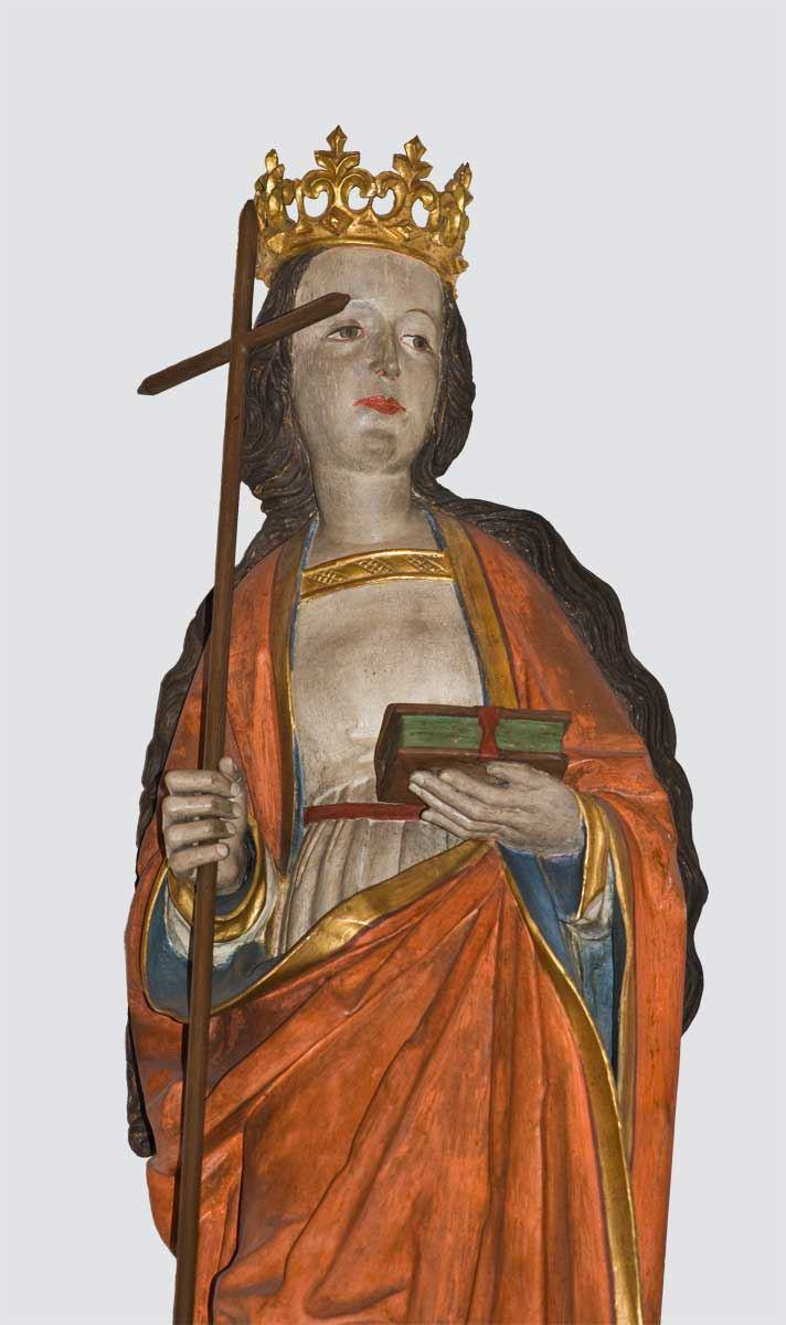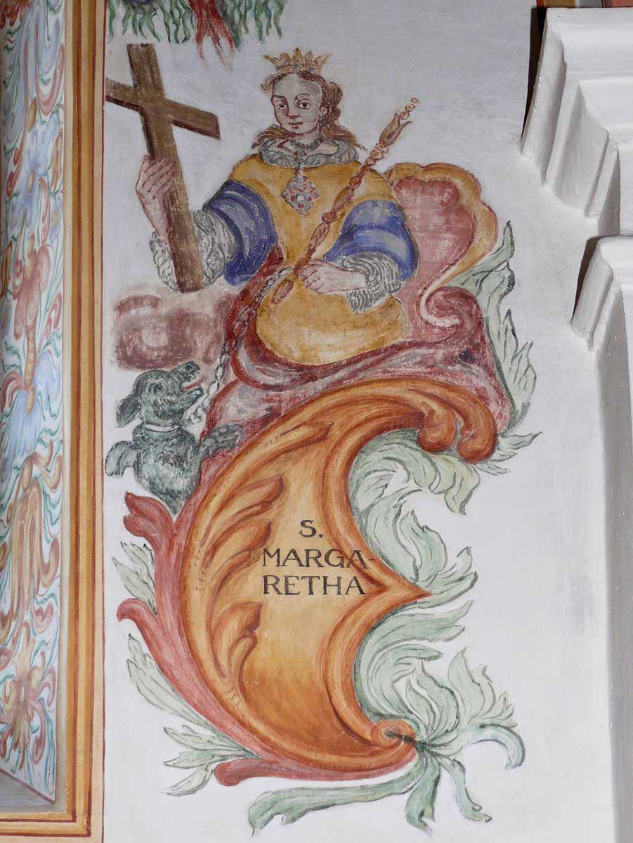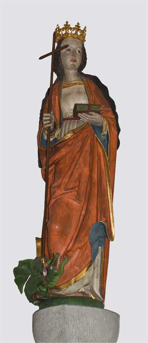 Margaretha wird häufig so auf dem Gnadenaltar in Vierzehnheiligen zusammen mit einem Drachen dargestellt. Ein weiteres Attribut ist ein kleines Kreuz. (Wikipedia)