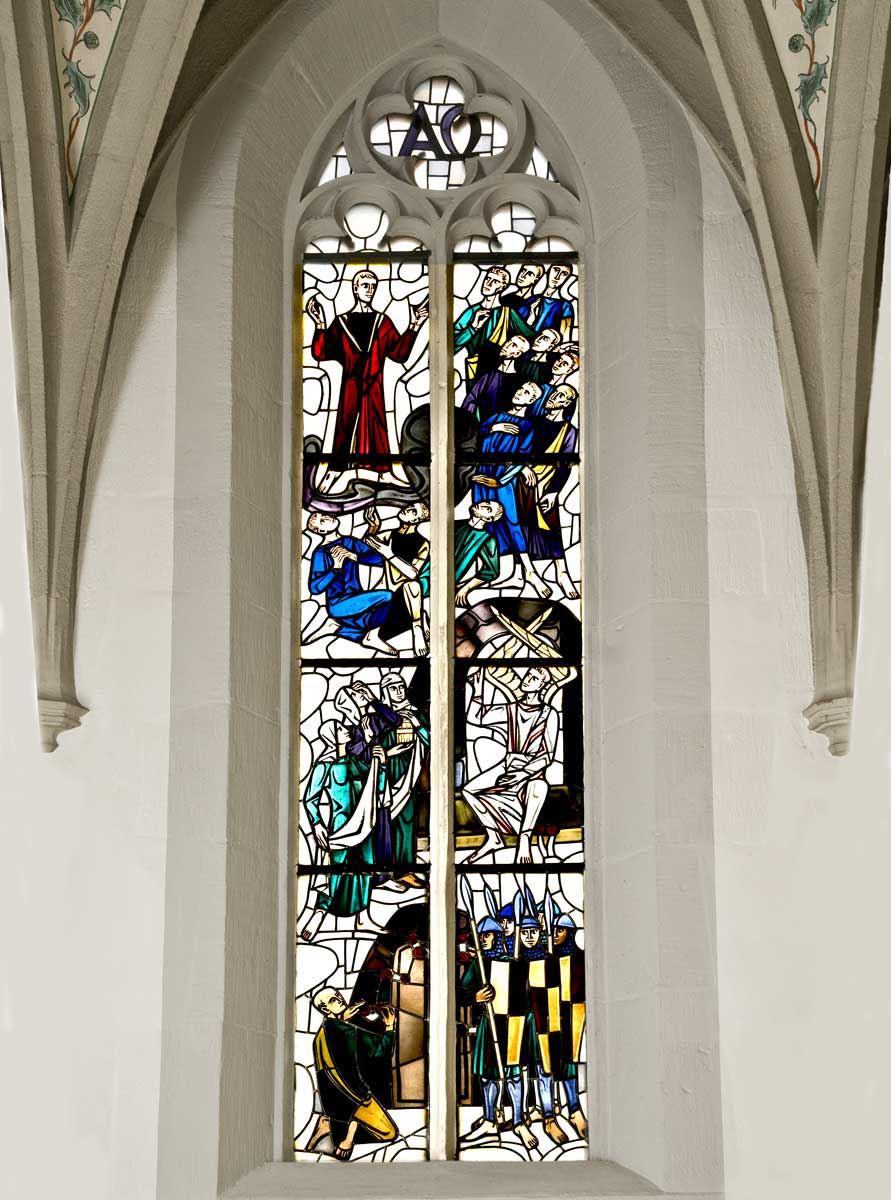 1960 wurden drei farbige Chorfenster aus der Werkstatt von Valentin Saile, Stuttgart, eingefügt, die Adolf Valentin Saile gestaltet hat. An diese Zeit der Entstehung der Fenster erinnert die Jahreslosung 1959, in einem Feld des linken Chorfensters: "Glaubet ihr nicht, so bleibet ihr nicht" (Jesaja 7,9). Die drei Chorfenster zeigen das dreifache Wirken Gottes: in der Gemeinde des Alten Bundes, in Jesus Christus und dann in der Gemeinde des Neuen Bundes.
