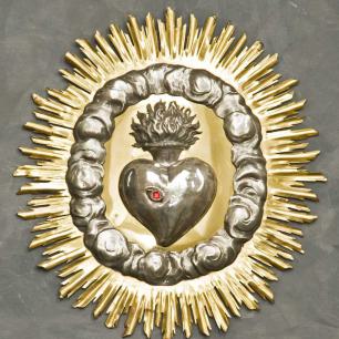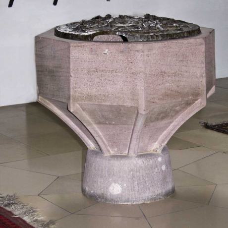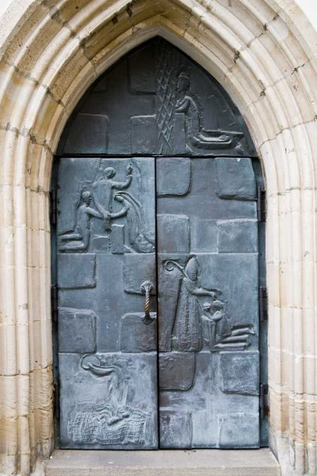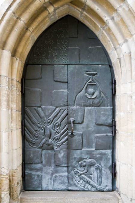 "Die Bronzetüren, Werke des Münchener Bildhauers Prof. J. Henselmann aus dem Jahr 1961, tragen symbolhafte Darstellungen der sieben Sakramente." (Kirchenführer 1990)