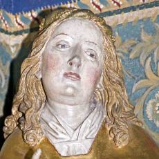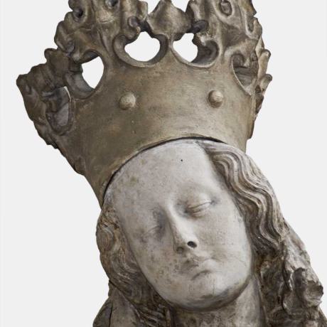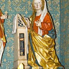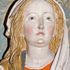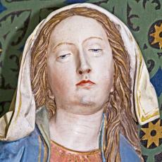Weil ich vermutlich von Anfang an eine Krone hatte, die allerdings 1917 nicht mehr vorhanden war, schuf mir der Restaurator eine neue, die ich jetzt noch trage. Die demütige Magd des Herrn - und solch eine Krone? Ich glaube, man sieht es mir an, wie sie mich niederdrückt. Nach der Renovierung der Stiftskirche wurde ich 1987 hier im Frauenchörle aufgestellt. Hier werde ich von den Kunstkennern bestaunt und bewundert. Am meisten freue ich mich jedoch über die Besucher, die zu mir kommen, um zu beten.