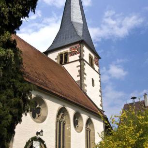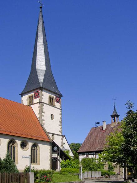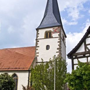 "Ursprünglich war die Kirche im romanischen Stil erbaut. Sie war wohl kleiner, schmäler und niedriger und wurde im Jahr 1458 in der heutigen Form erstellt und zwar von Baumeister Balthasar von Horrheim im gotischen Stil. Dies geht aus der Inschrift über dem westlichen Kielbogenportal hervor. Neben dem vermauerten Schluss-Stein mit einem Christuskopf befindet sich ein Stein mit dem Wappen der Thumb, der Ortsherrschaft im 16. Jahrhundert, mit der Inschrift: