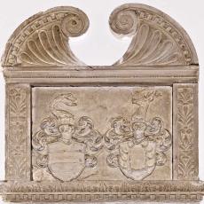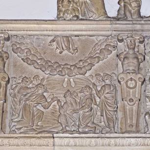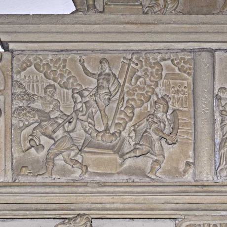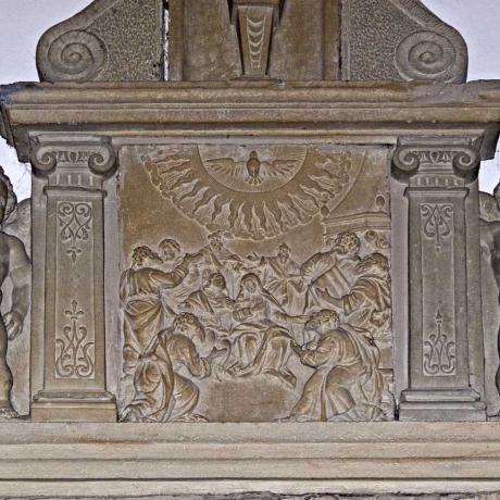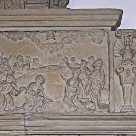 Um die großen Grabmale finden sich verschiedene Ahnenwappen eingehauen. Über den beiden Figuren ist die Darstellung von der Auferstehung Christi, der Himmelfahrt und Pfingsten.