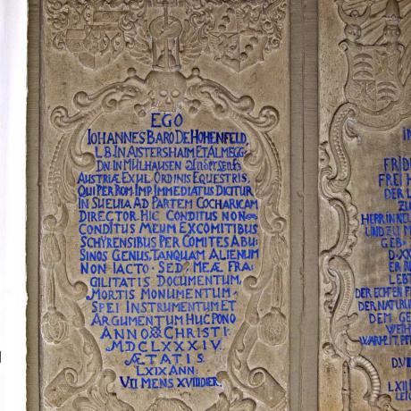 Grabstein des Johann von Hohenfeld "aus Osterreich vertrieben": Hier begraben, nicht verborgen, rühme ich mich nicht meiner gleichsam fremden Herkunft von den Grafen von Scheiern (Vorfahren der Wittelsbacher) über die Grafen von Abensburg, sondern errichtete hier einen Beweis meiner Hinfälligkeit, ein Denkmal des Todes, eine Steintafel der Hoffnung. Im Jahre Christi 1684 im Alter von 69 Jahren, 7 Monaten und 18 Tagen.