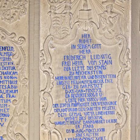 Daneben findet sich der Grabstein der nächsten Schlossherrschaft, Freiherr Ludwig Friedrich von Stain mit den Angaben: 1712 geboren, 1774 gestorben im Alter von 62 Jahren, regierte 37 Jahre (1737 bis 1774), hat 45 Jahre hier gelebt.