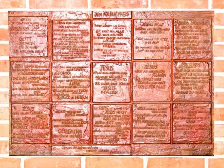 Vor und hinter dem Altar hat Hajek in je 7 Feldern Texte aus der Offenbarung Johannis, Kapitel 5, Verse 1 - 10 in den Boden eingelassen: