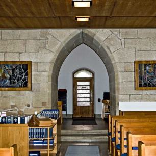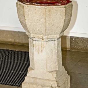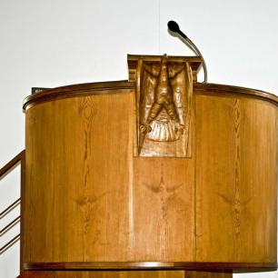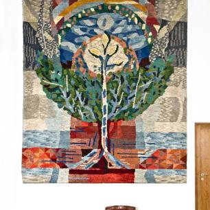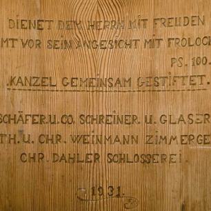 4 · Kanzel, Wandteppich, Taufstein