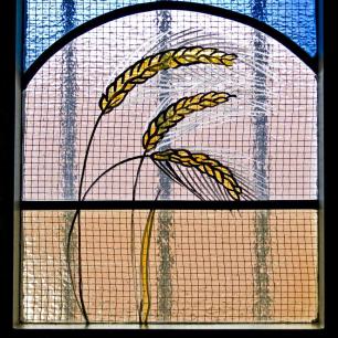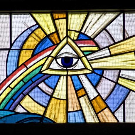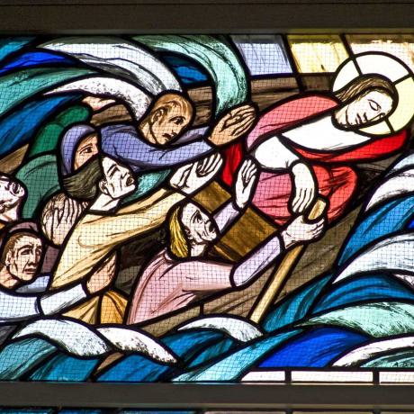Das folgende Fenster zeigt die Stillung des Sturmes (Mk. 4,35-41). Darüber das Auge im gleichschenkligen Dreieck, als Symbol für Gott Vater. Es erinnert daran, dass Gott, der die Erde geschaffen hat, Erde, Himmel, Wind und Wasser gehorchen. Der Regenbogen weist auf Gottes Versprechen nach der Sintflut hin. Das Auge steht für Gottes Gegenwart. Gott sieht alles. Für die Trinität stehen die drei gleichen Seiten des Dreiecks und die drei Strahlen, die von dem Auge ausgehen. Einer dieser Strahlen trifft Jesus, der auf seinen Vater vertrauend im Boot schläft. Die Jünger in ihrer Angst sind dagegen von einer Welle umgeben.