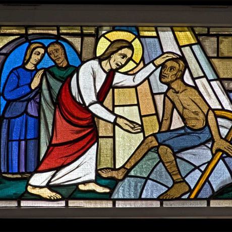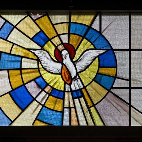 Bei der Heilung des Gelähmten (Mk. 2,1-12) erscheint im oberen Teil des Fensters die Taube als Symbol des Heiligen Geistes. In den Evangelien wird berichtet, dass Jesus dem Kranken die Sünden vergibt, ehe er ihn heilt. Die Vergebung der Sünden geschieht durch die Kraft des Heiligen Geistes. Deshalb wird der Kranke von einem Strahl, der von der Taube ausgeht, umfangen. Die Flamme neben der Taube erinnert an Pfingsten, das Fest des Heiligen Geistes. Während sich die Jünger im Tempel versammelten, erschienen an Pfingsten Flammen auf ihren Häuptern.