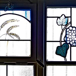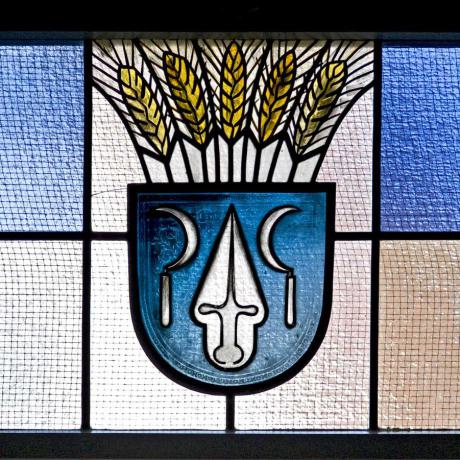 An der Nordwand befindet sich ein Fenster Gräsers mit dem Sielminger Wappen, in der Sakristei eines mit Ähren und Weintraube.