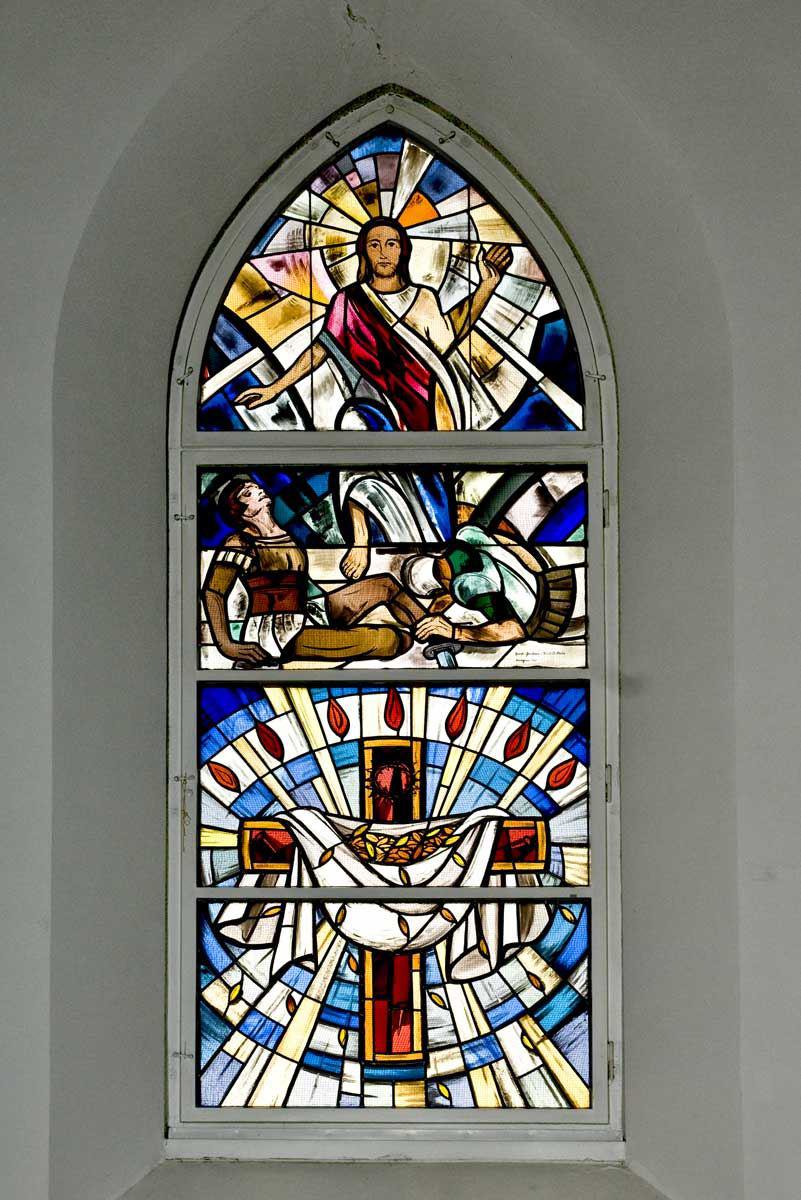 Das Christus-Fenster zeigt die Auferstehung (von Ernst Gräser) und darunter ein symbolisches Kreuz (von Anne-Dore Kunz-Saile). Das Kreuz nimmt das Rot des Mantels Jesu bei der Auferstehung auf. Im Kreuz sind Nägel und die Dornenkrone zu erkennen. Um das Kreuz hängt ein Saattuch aus dem Körner fallen. Sie sind Hinweise auf die Gleichnisse vom Sämann (Mk. 4,2-9) und vom Weizenkorn (Joh. 12,24). Durch Christi Tod und Auferstehung haben alle Menschen Hoffnung auf das ewige Leben. Über dem Kreuz erscheinen sieben Flammen. Sieben Leuchter stehen in der Offenbarung um den Thron Gottes (Offb. 4,5). Die Flammen stellen auch eine Verbindung zum Fenster mit der Heilung des Gelähmten her.